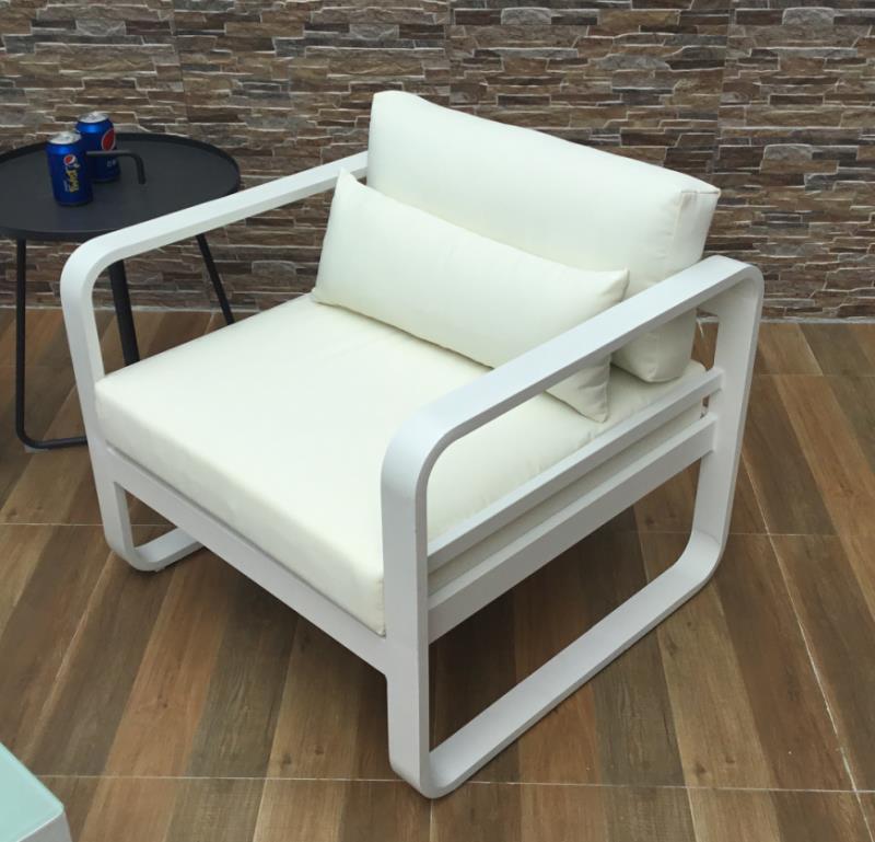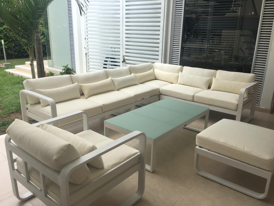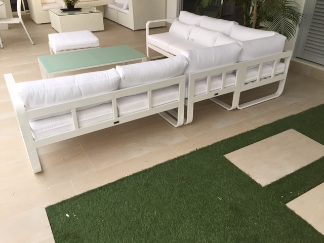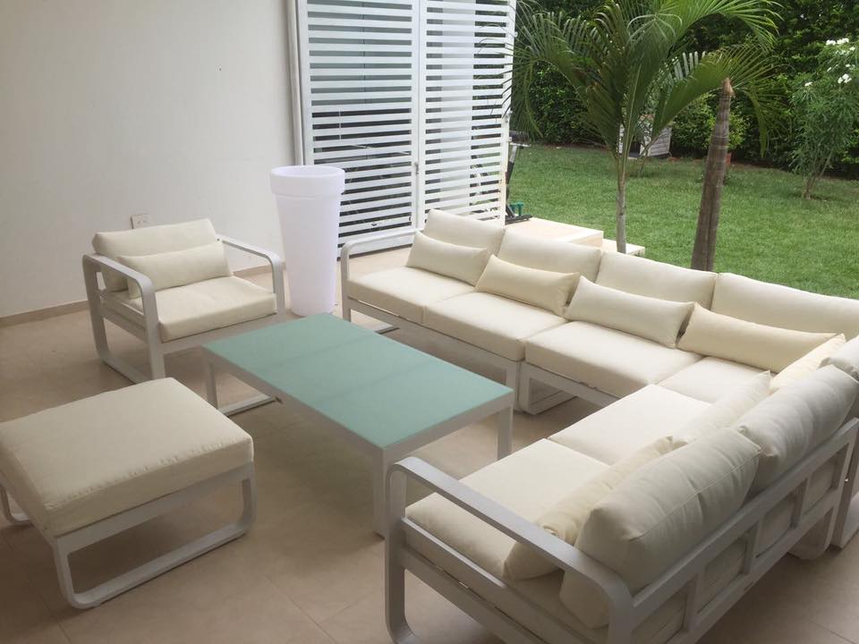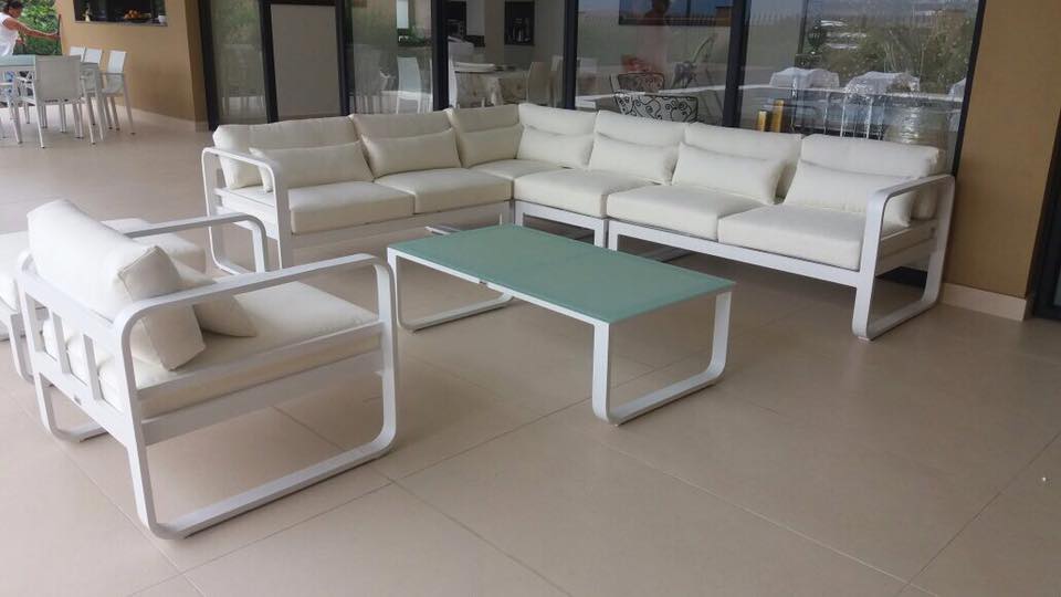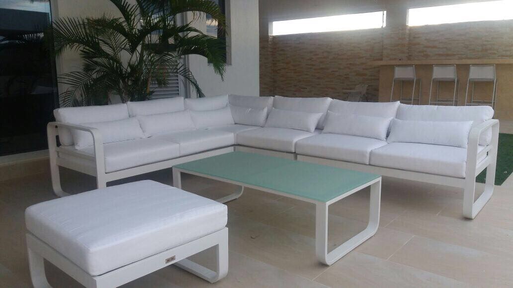 Sala exterior en L estructura en aluminio liviana y resistente. capacidad 7 puestos, mesa en vidrio templado. Cojineria 100% lavable resistente rayos UV. Medidas: L=2.0x3.20ml - Mesa: 1.20mx65cms -Sillon: 80x80cms-Puff: 80x80cm
