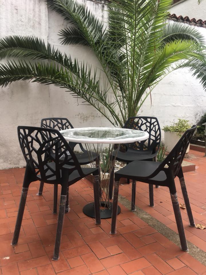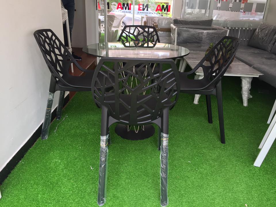 Comedor en vidrio templado y estructura de acero resistente a la humedad. (4) Sillas en polipropileno color Negro. Diseño Moderno.