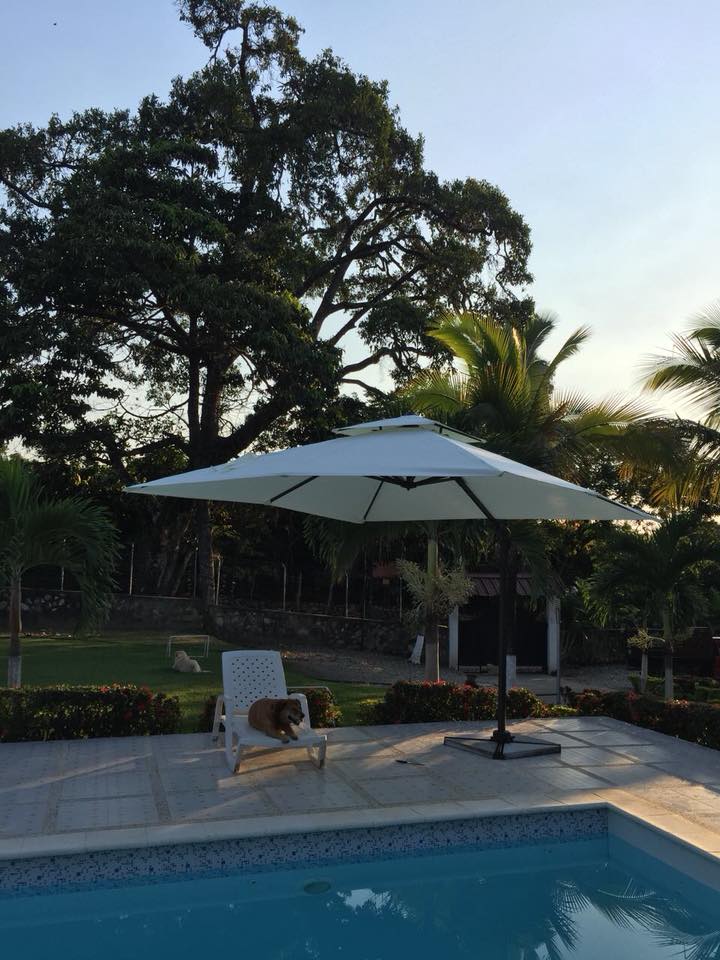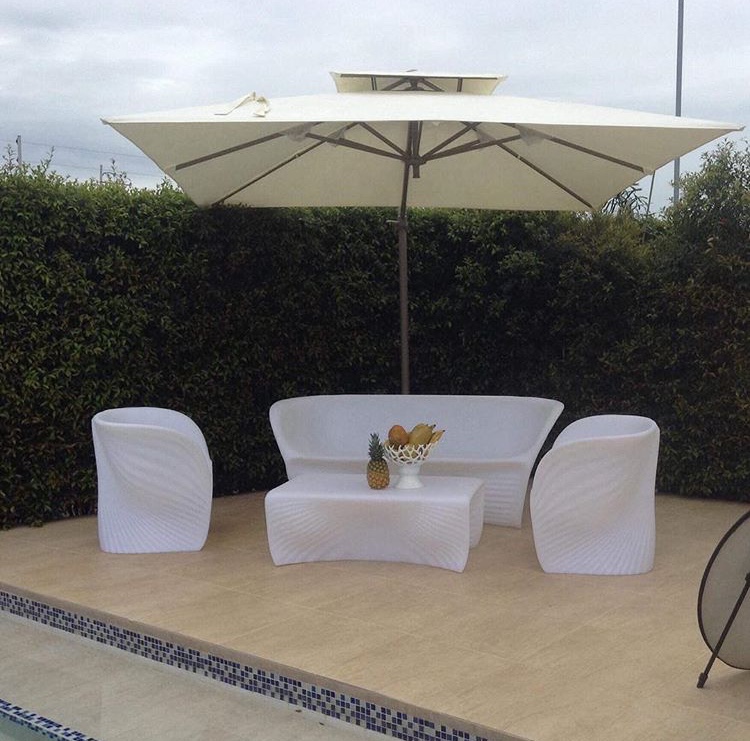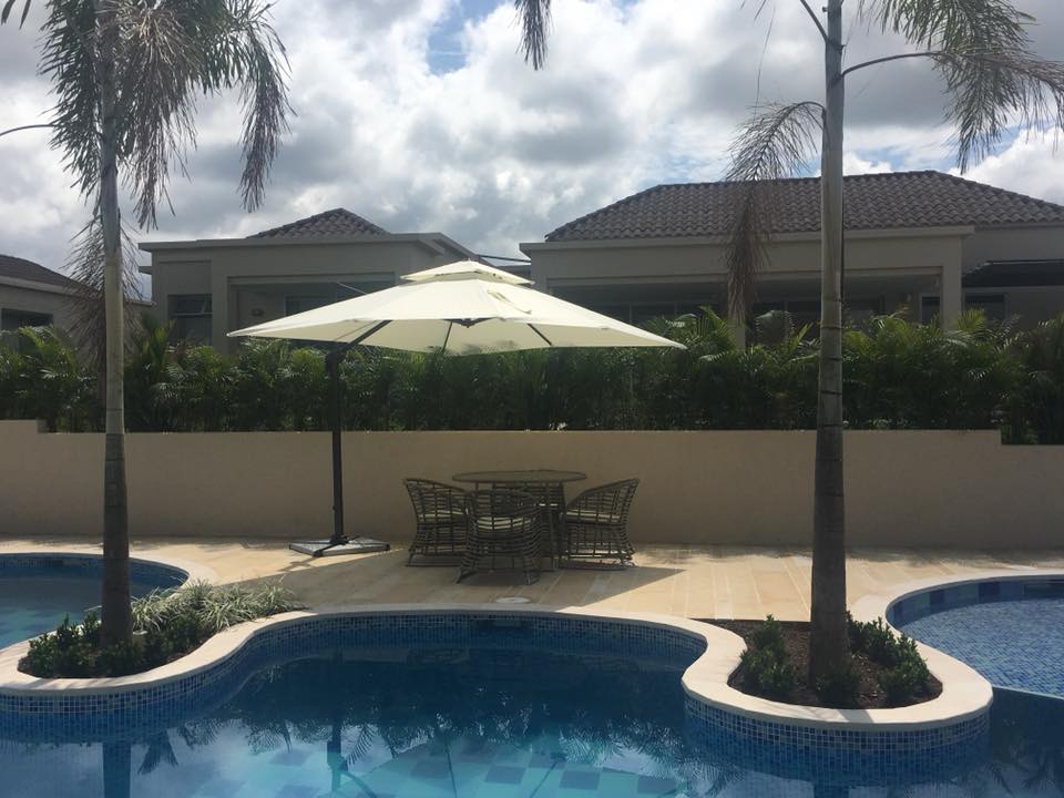 Parasol con diseño Moderno, Dimensiones 3.5x3.5ml bases en losa de granito. Lona Importada de gran durabilidad. Estructura en aluminio.